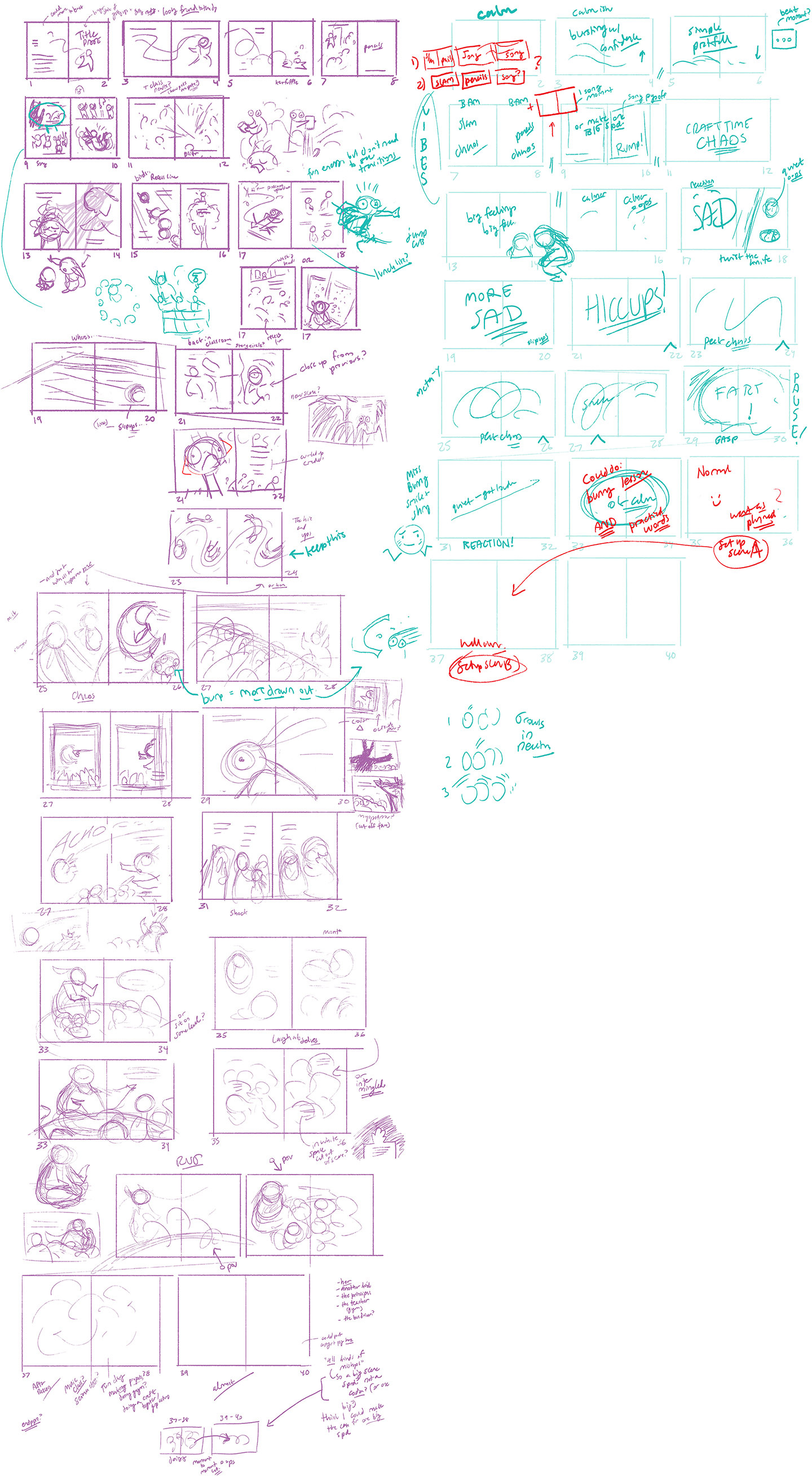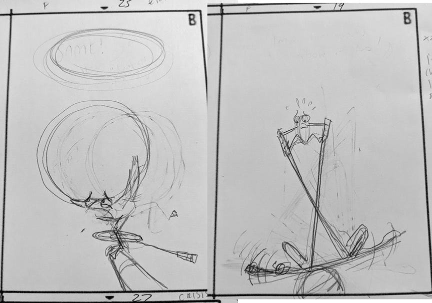 If you squint at my earliest pacing breakdown for the jokes, you can see me earnestly trying on different framing and pov for the Fart shot, trying to get that peak-Dolly-Zoom-Vertigo moment: